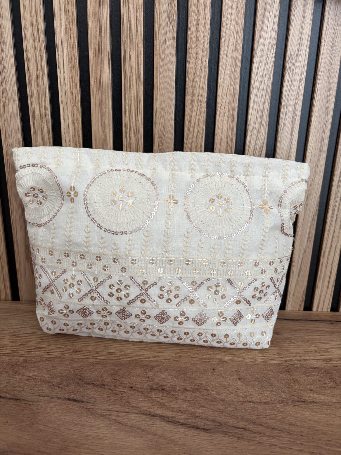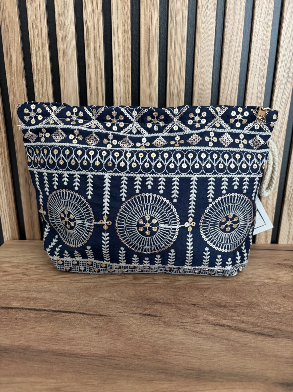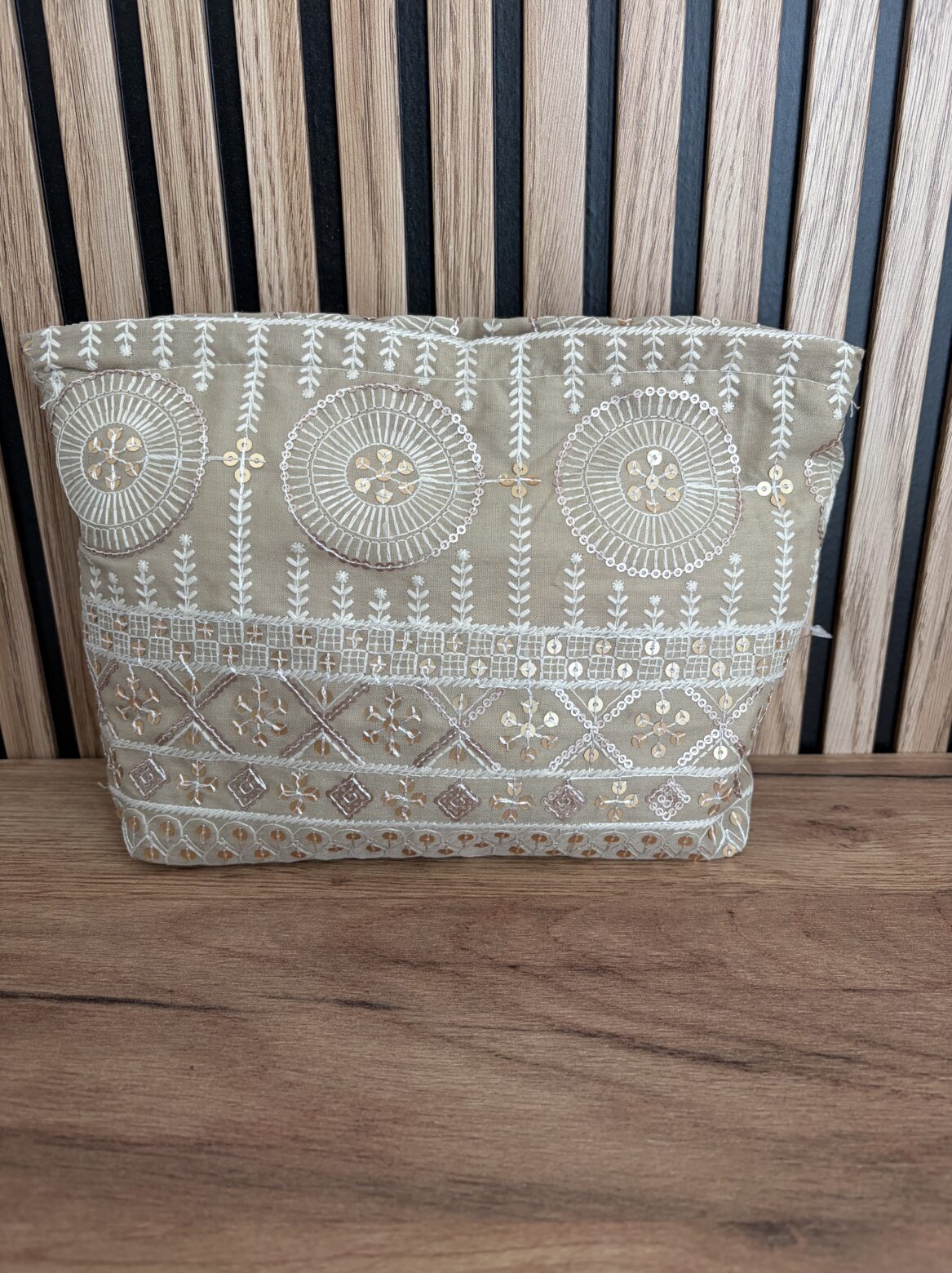 Bolsito de mano de tela y lentejuelas, con asa corta y forrado por dentro.