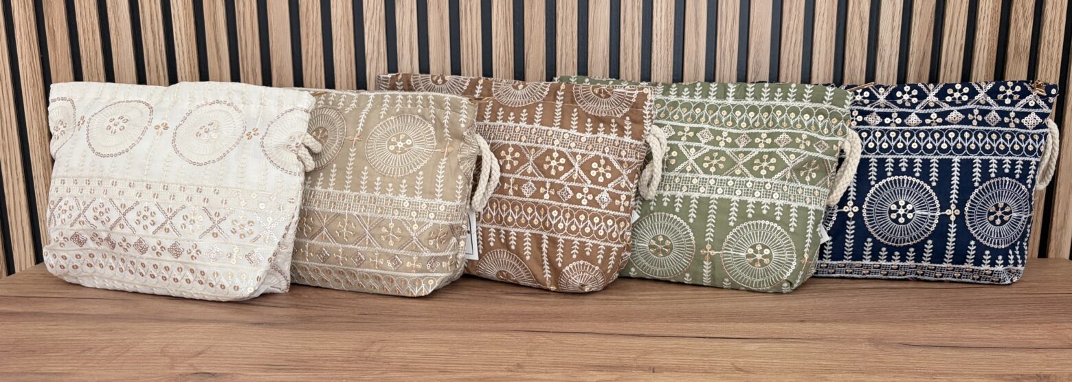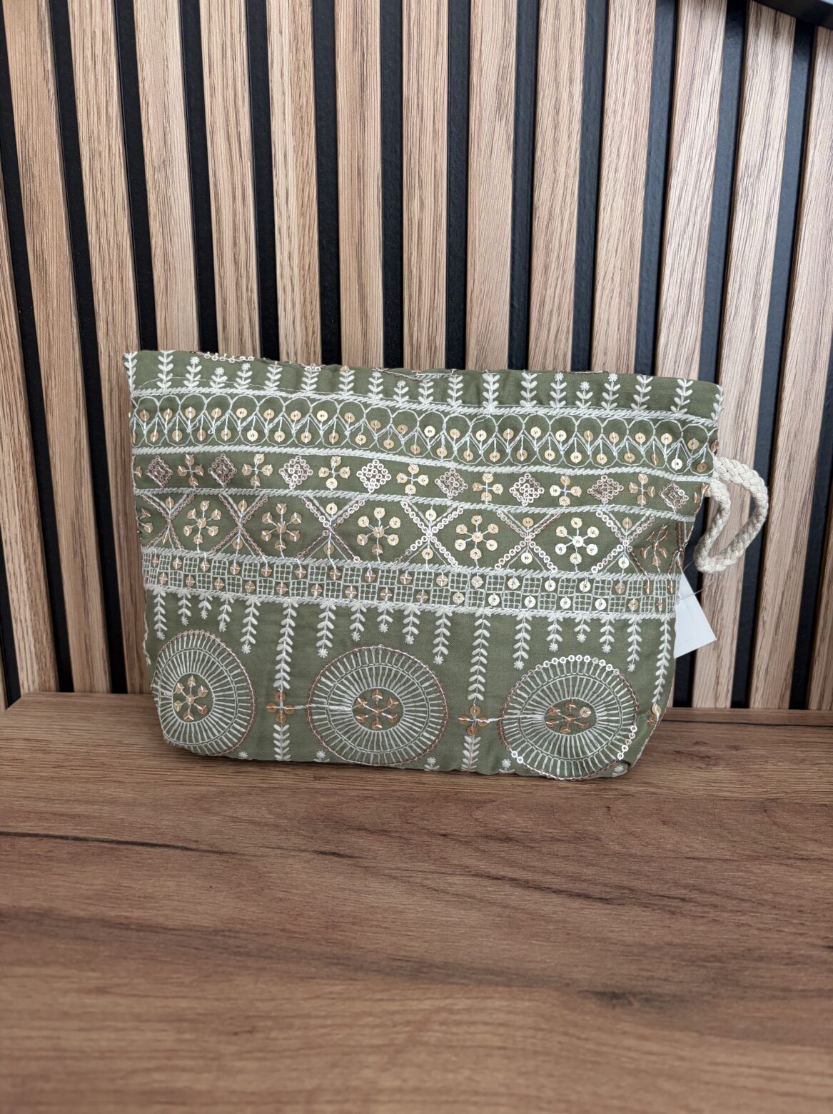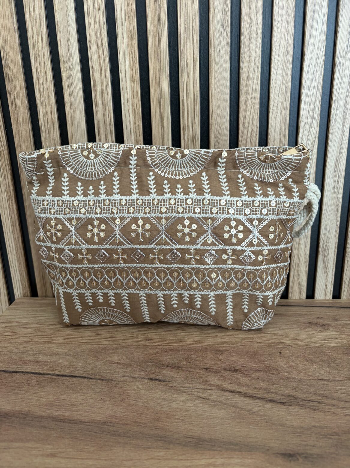 Bolsito de mano de tela y lentejuelas, con asa corta y forrado por dentro.
