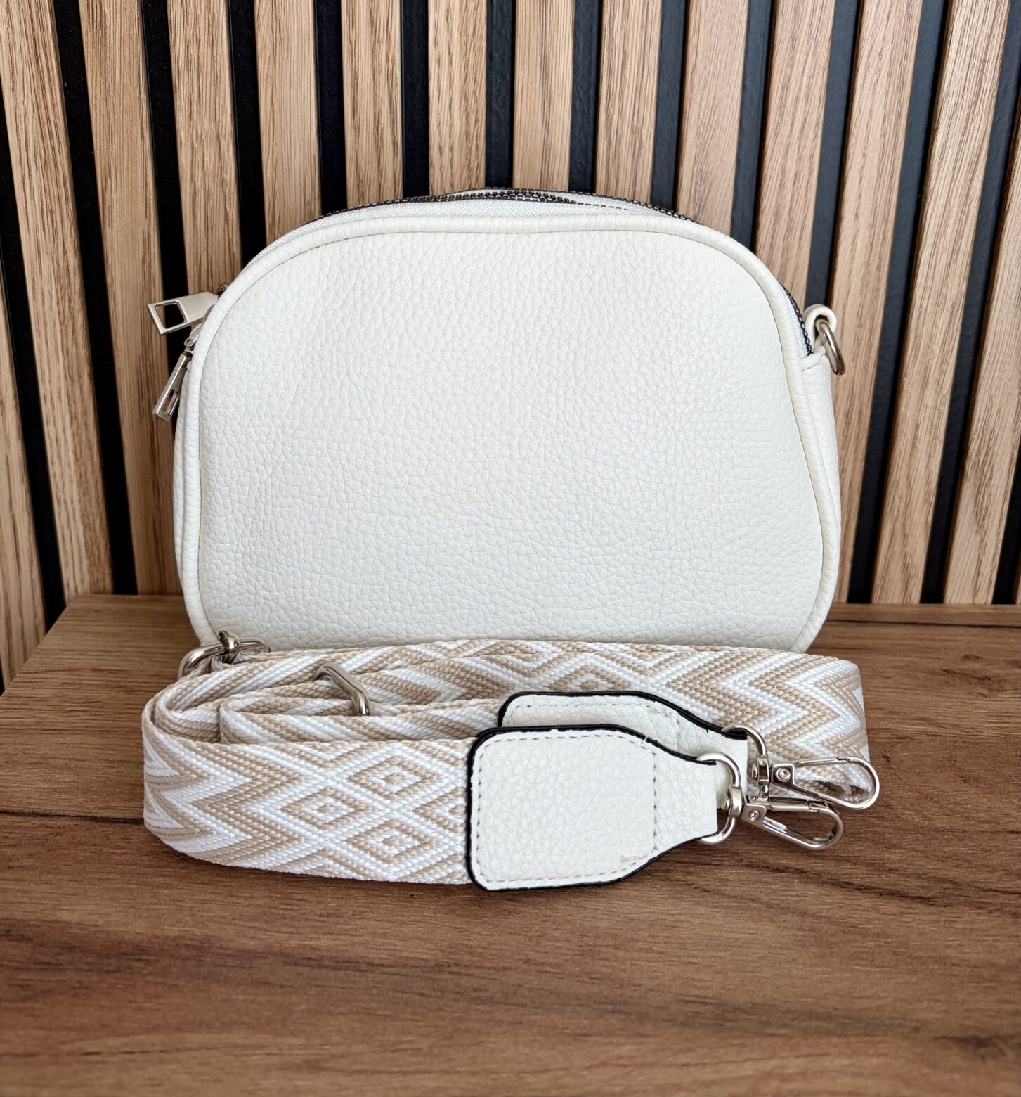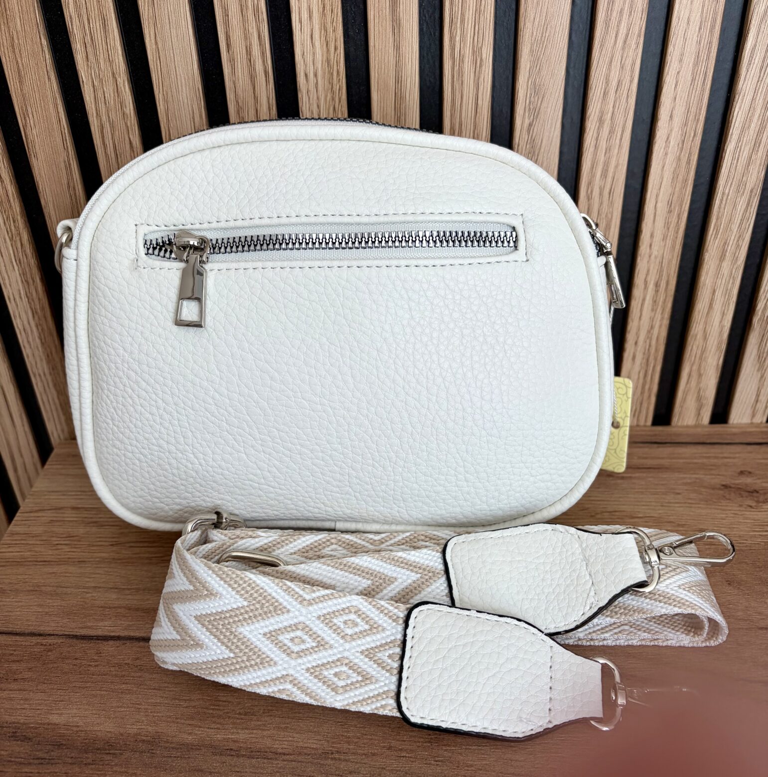 Bolso de polipiel 3 cremalleras en color blanco con asa larga regulable de tela estampada.