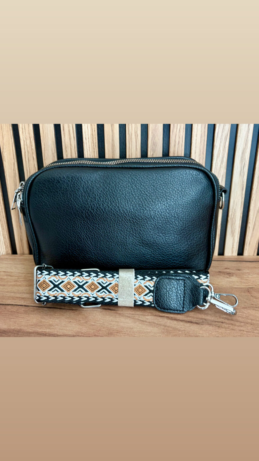 Bolso de polipiel 3 cremalleras en color negro con asa larga regulable de tela estampada.