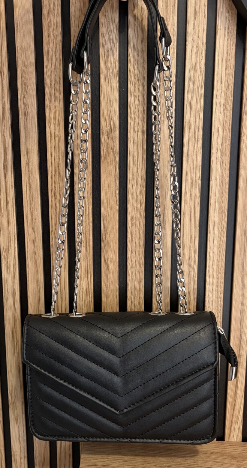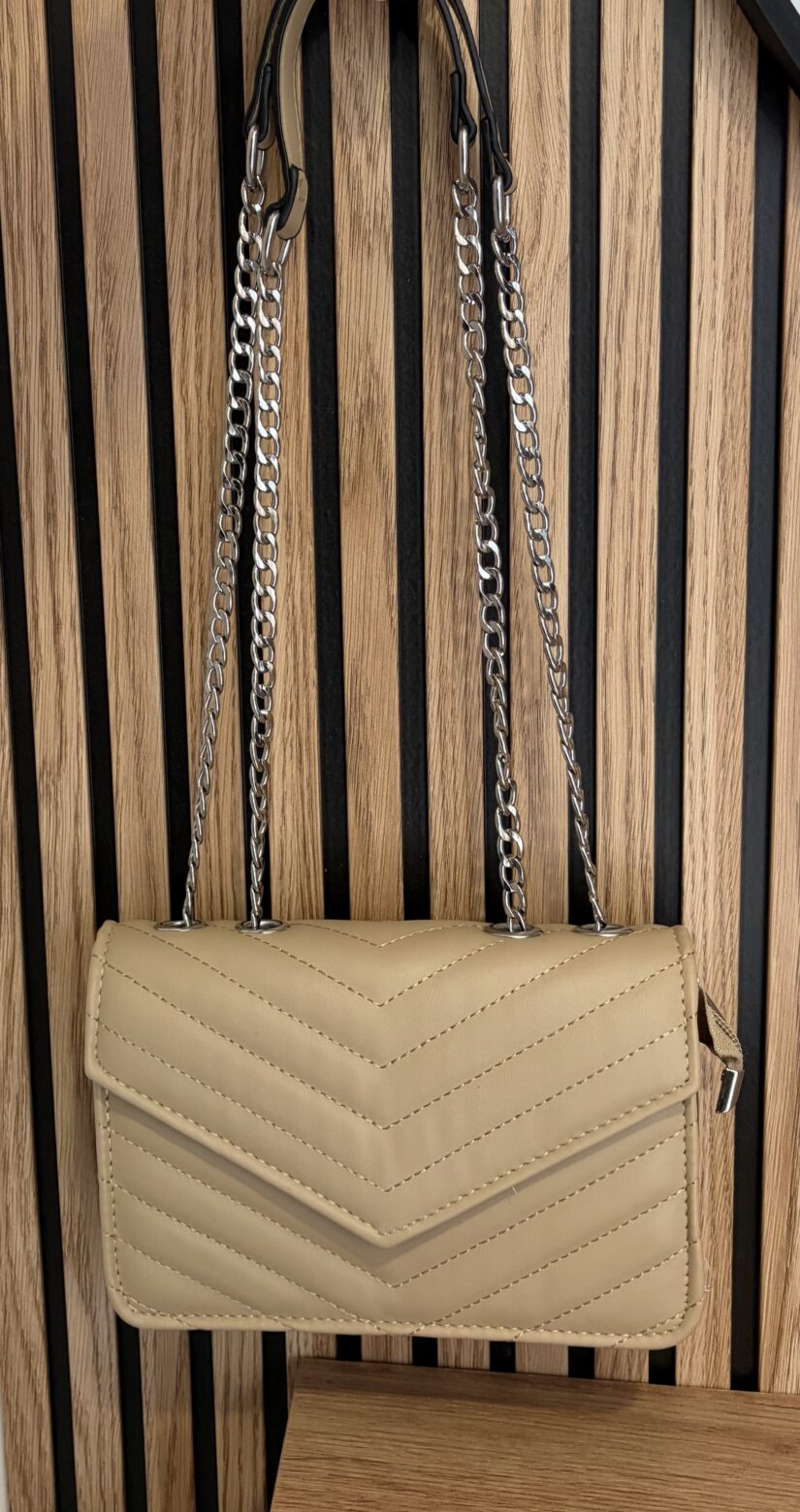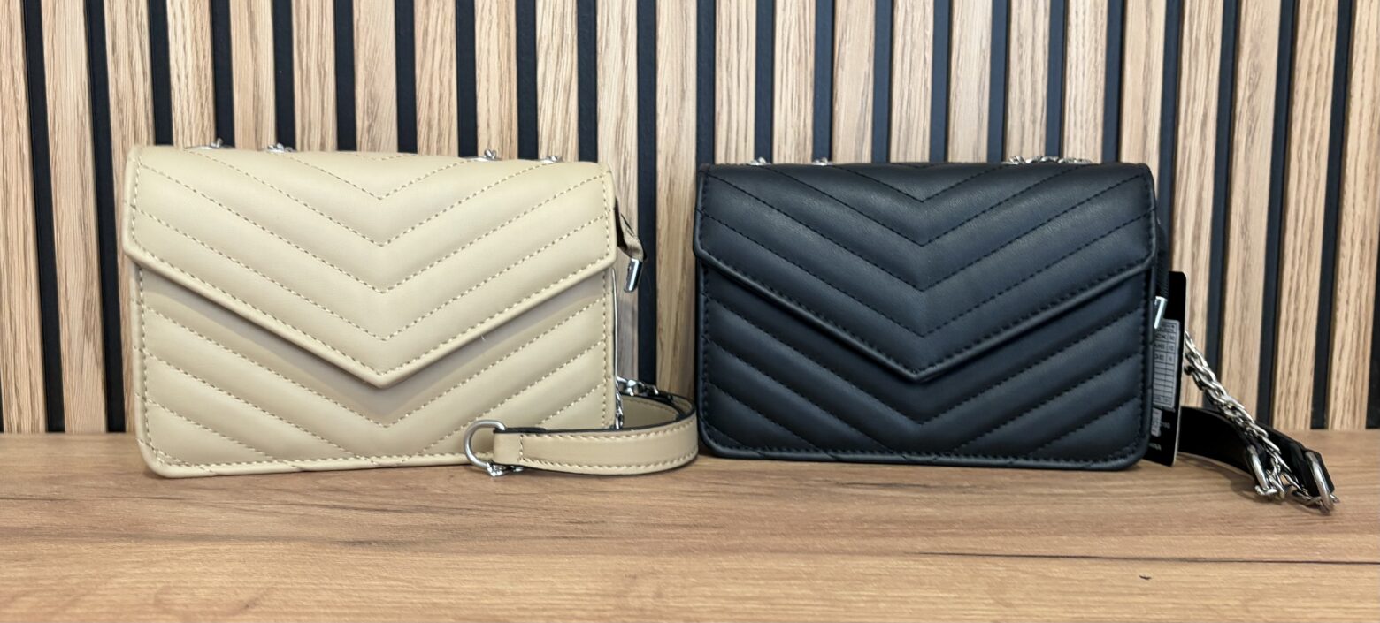 Bolso de polipiel con cierre de clip y cremallera y bolsillo interior, disponible en color beige y negro.