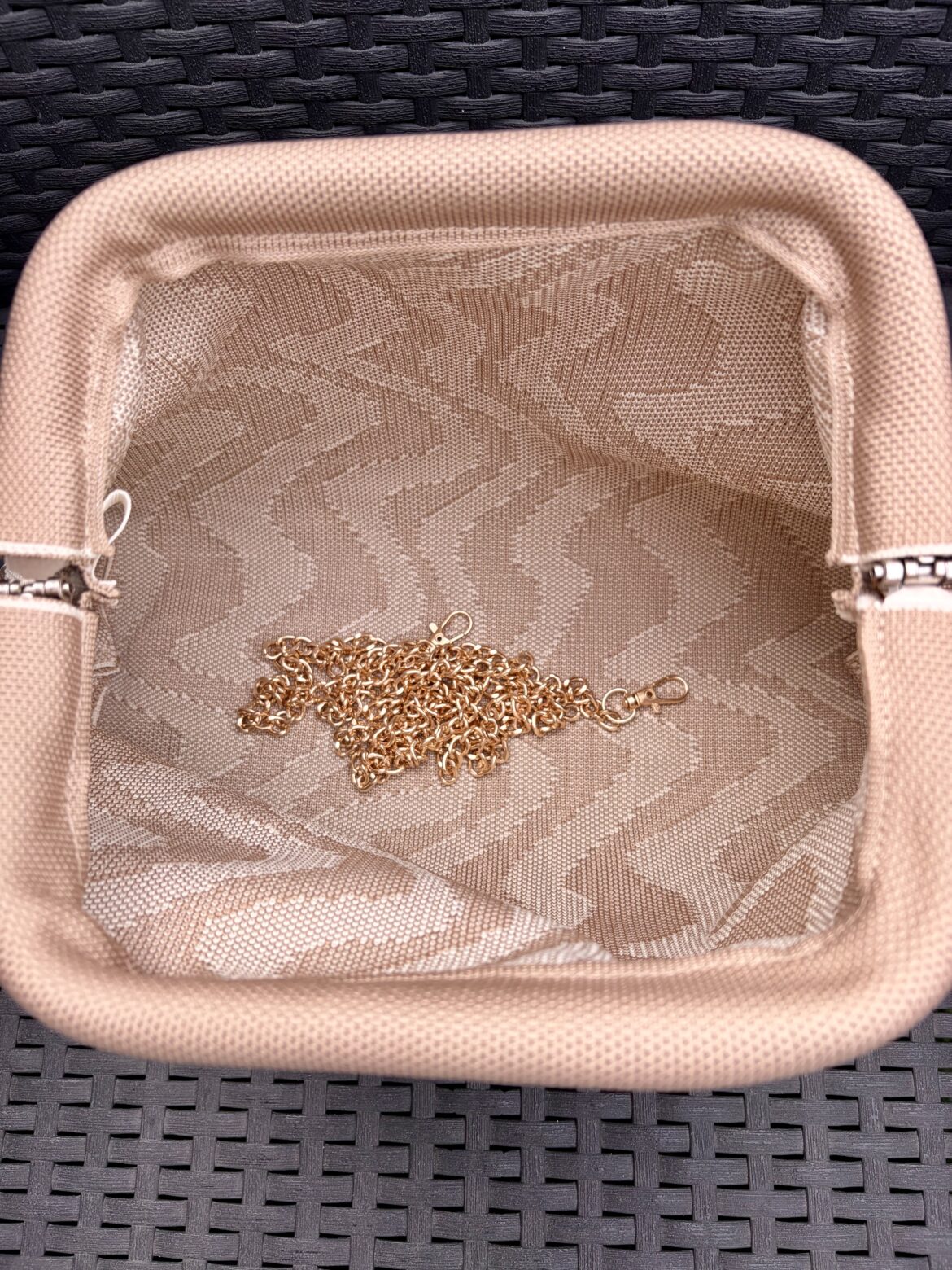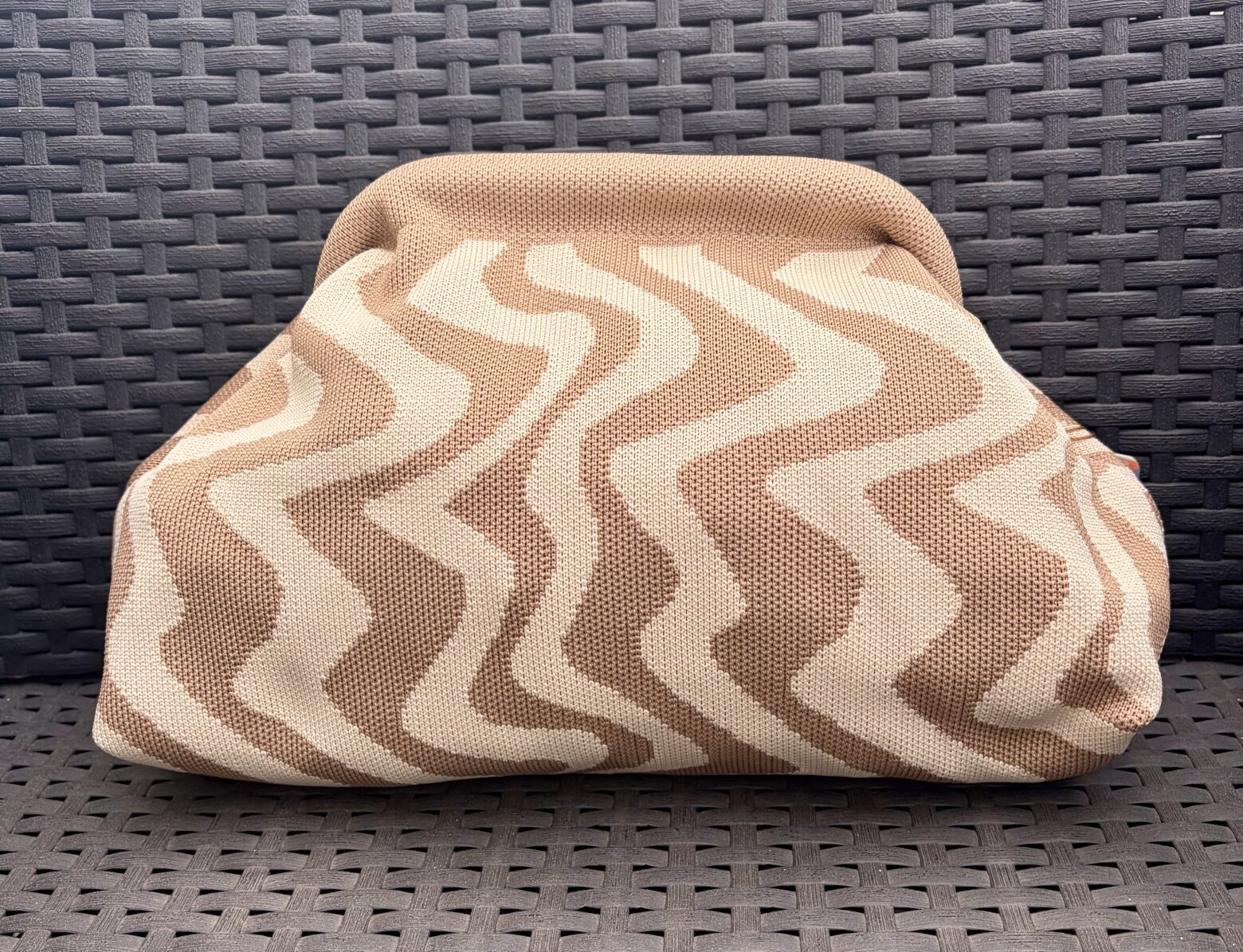Bolso de mano de punto con estampado de rayas en color beige y camel, tiene cadena para colgar.