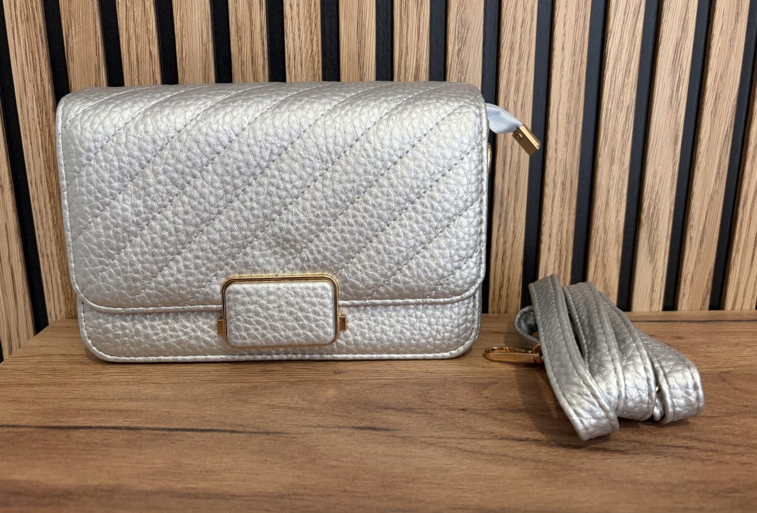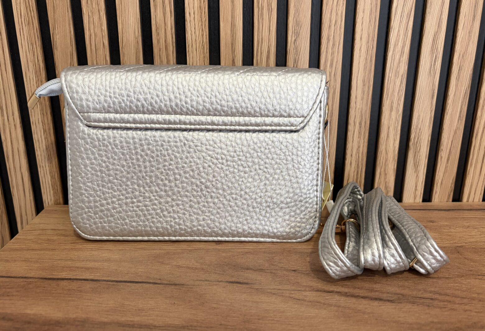 Bolso de polipiel plateado con cierre en clip y cremallera, tiene asa larga regulable.