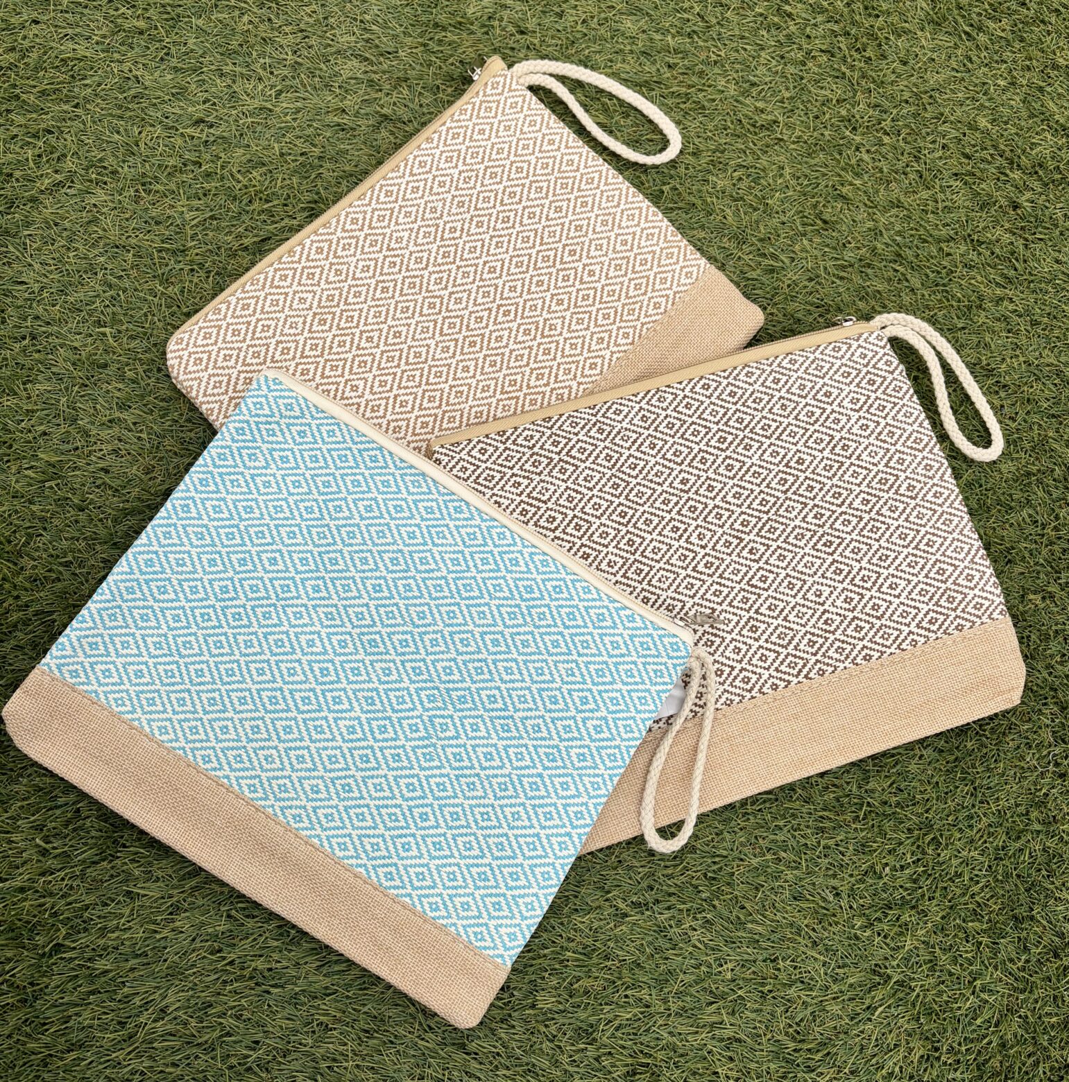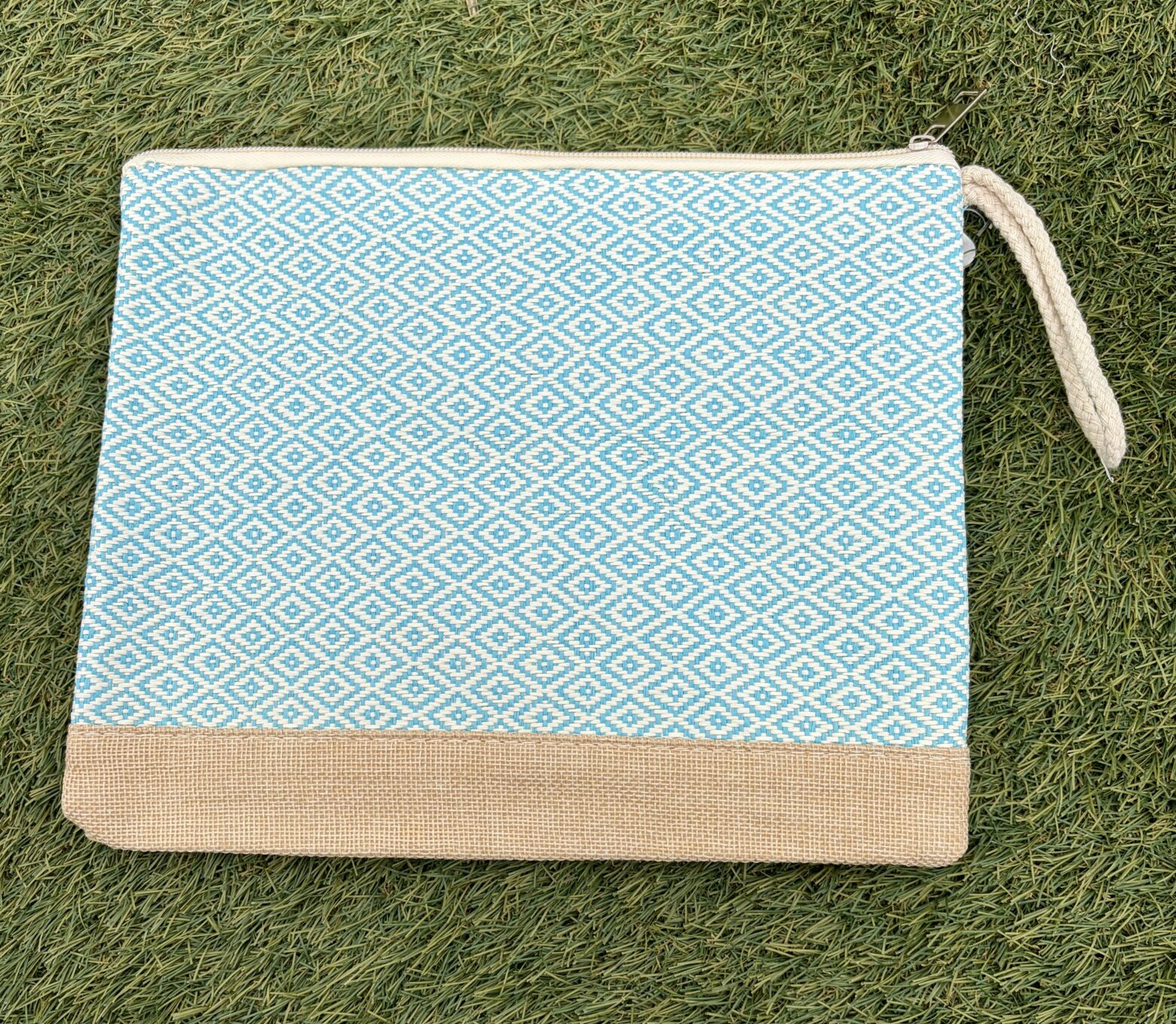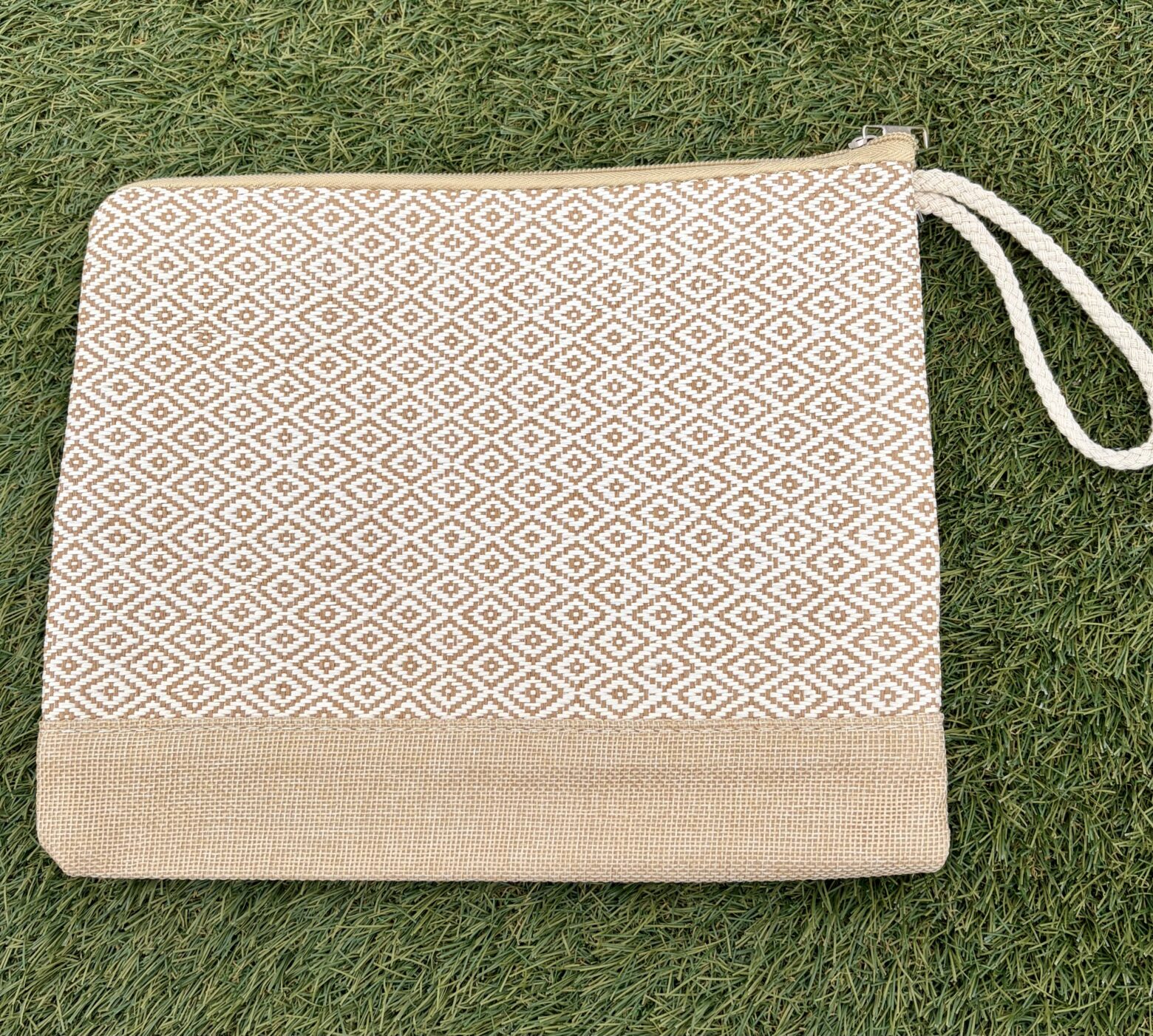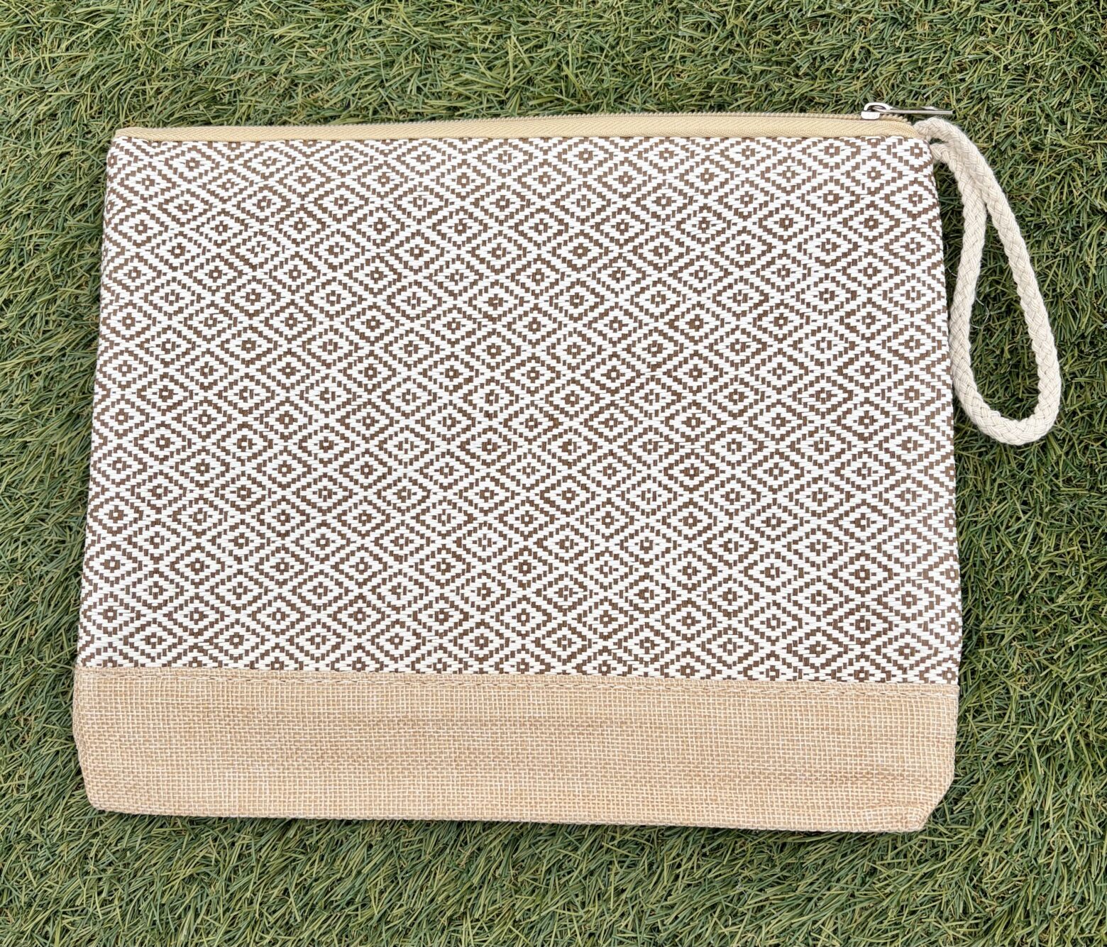 Cartera de mano con estampado de rombos, cierre con cremallera y forrado por dentro con asa corta.
