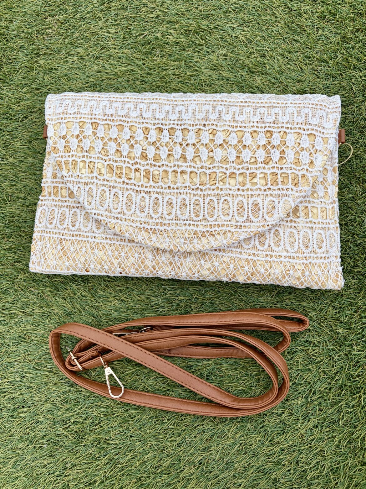 Cartera de mano de crochet y rafia con cierre de clip y bolsillo interior, tiene asa corta y asa larga para colgar regulable.