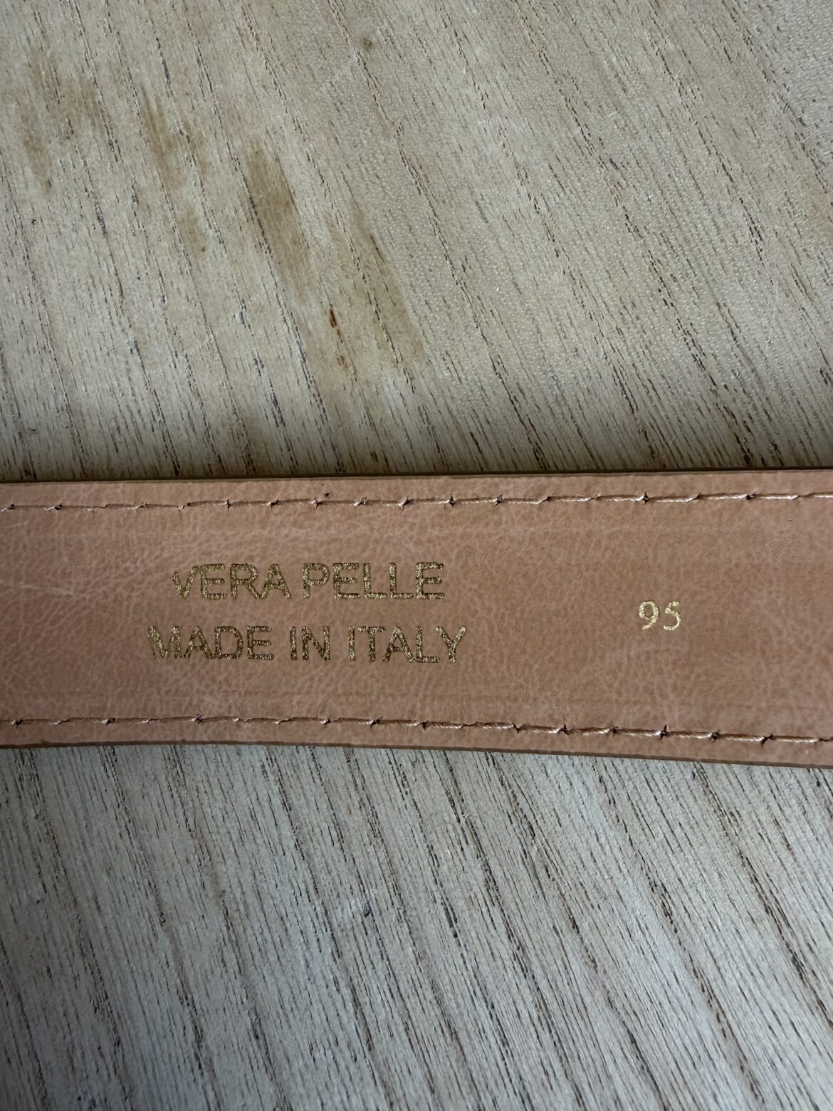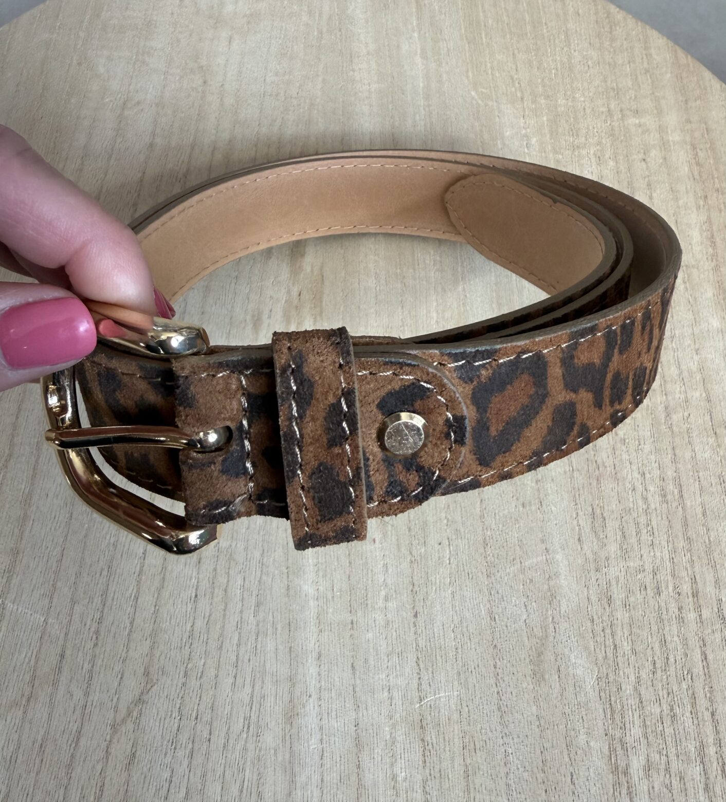 Cinturón de piel con estampado de leopardo y hebilla dorada.