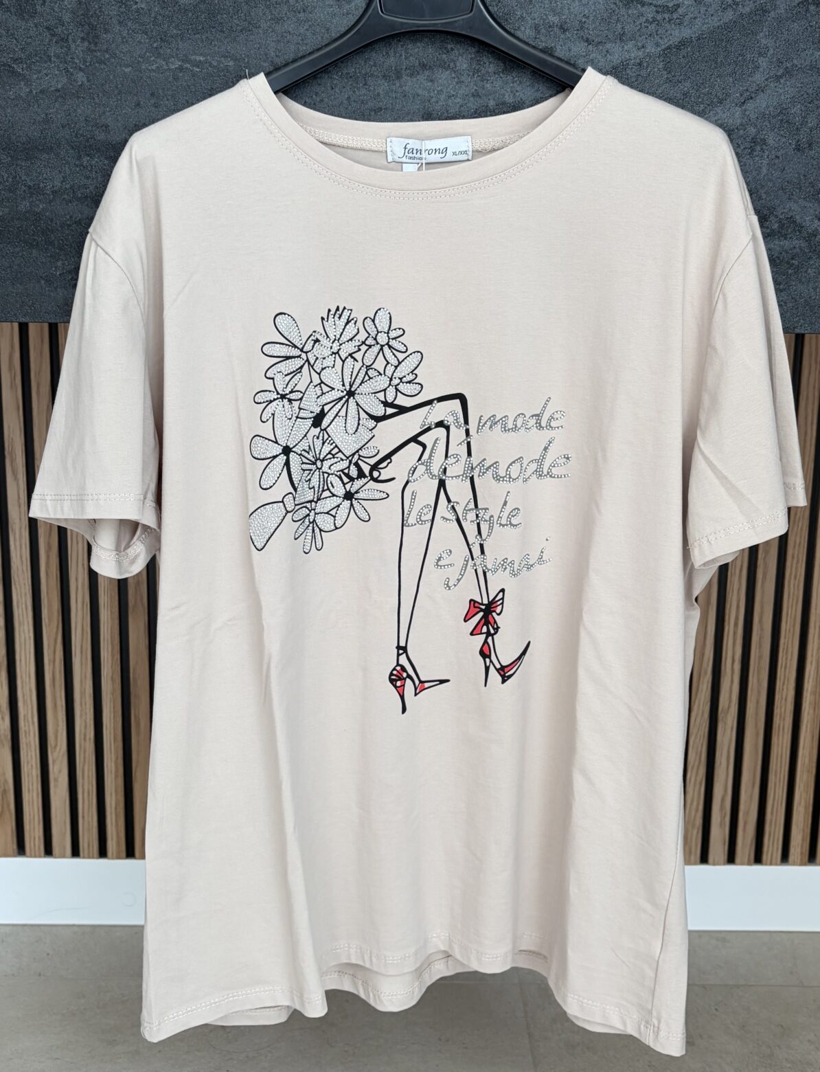 Camiseta brillitos en color beige y dibujo delantero, talla XL/XXL