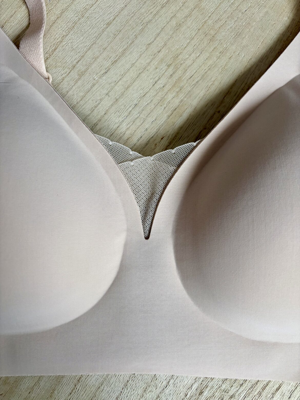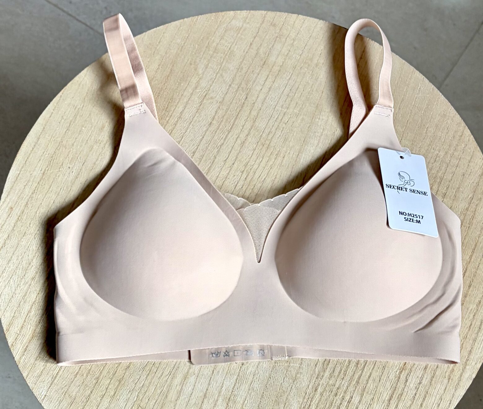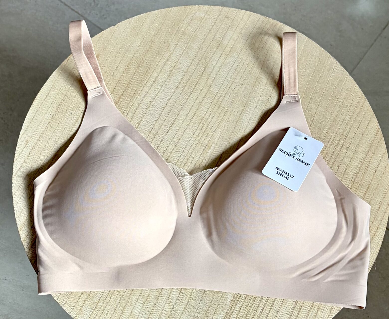 Sujetador Secret Sense modelo H2517, en color beige con adorno de encaje sin aros, tiene cascos extraíbles, tira regulable y cierre con 2 corchetes.