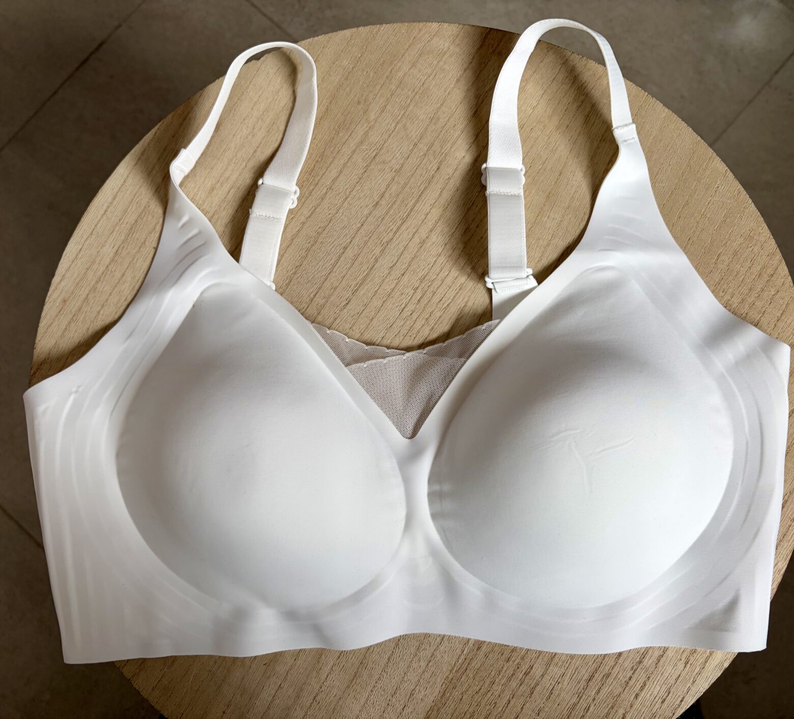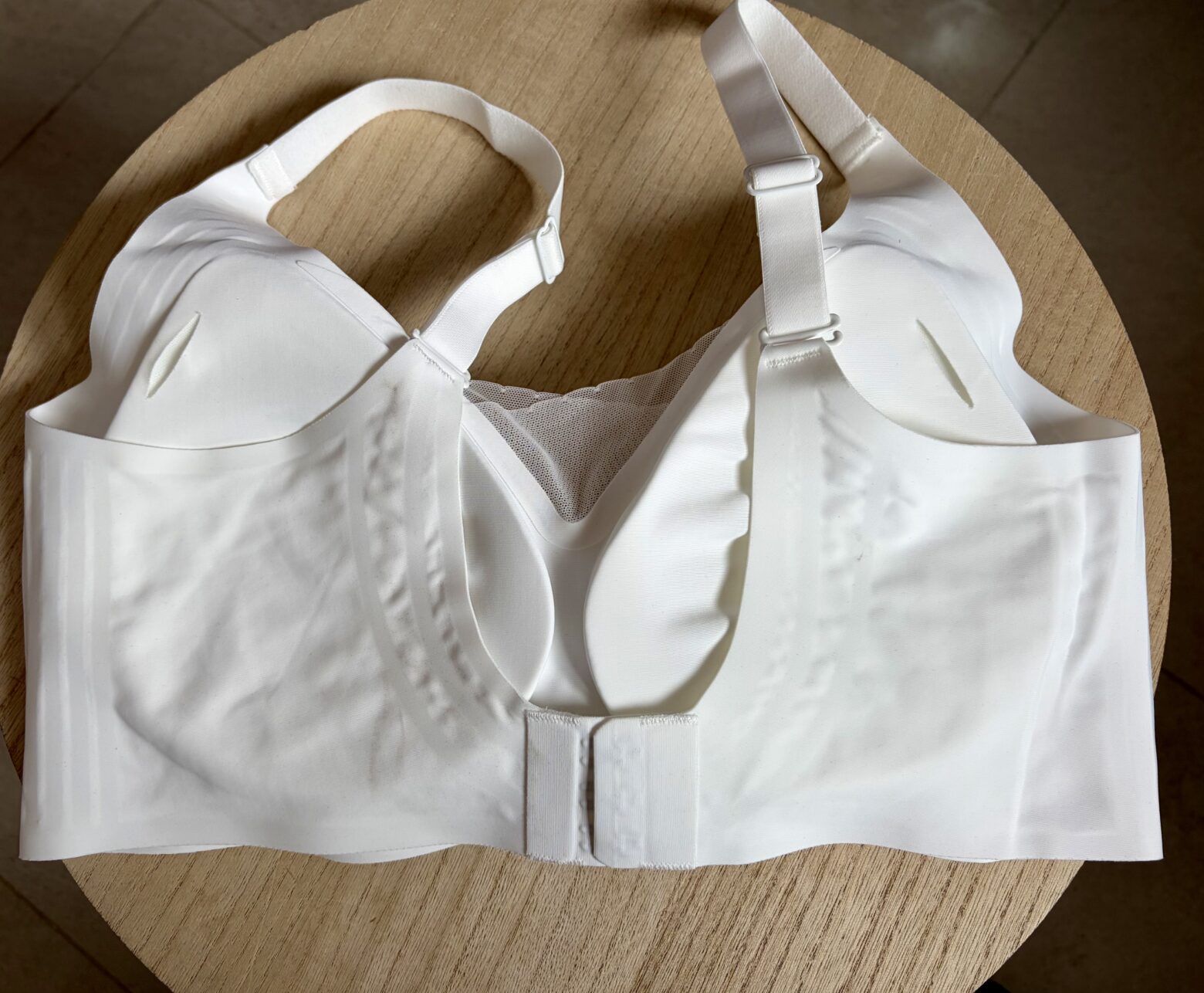 Sujetador talla grande en color blanco con adorno de encaje, sin aros, tiene cascos estraíbles, tira regulable y cierre con 3 corchetes.
