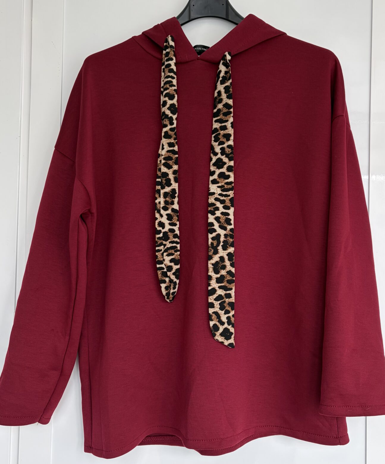Sudadera con capucha, en color burdeos y cuerdas con estampado de leopardo, talla única